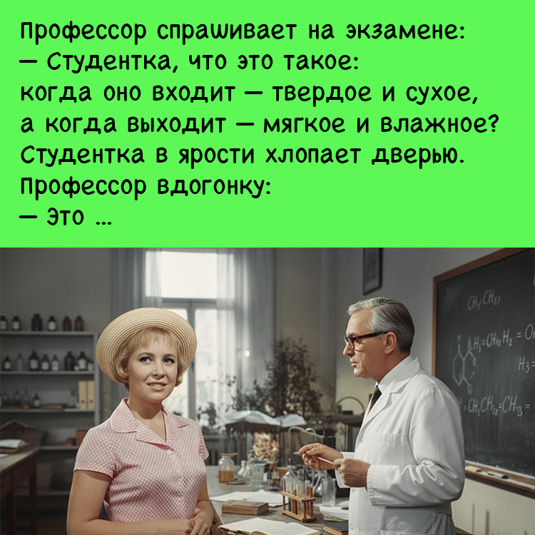 Химия — наука сложных формул и опасных реакций, но когда за лабораторный стол садится блондинка, таблица Менделеева начинает играть новыми красками. В этом анекдоте классический конфликт между строгим профессором и очаровательной студенткой переходит в плоскость практического применения знаний, где ответ на вопрос о свойствах благородных газов или составе молекулы воды звучит как откровение. Перед вами история о том, как одна маленькая пробирка и безграничная фантазия превращают скучный экзамен в фееричное шоу, доказывая, что настоящая химия случается не в колбах, а в умении вовремя и красиво выйти из тупиковой ситуации.