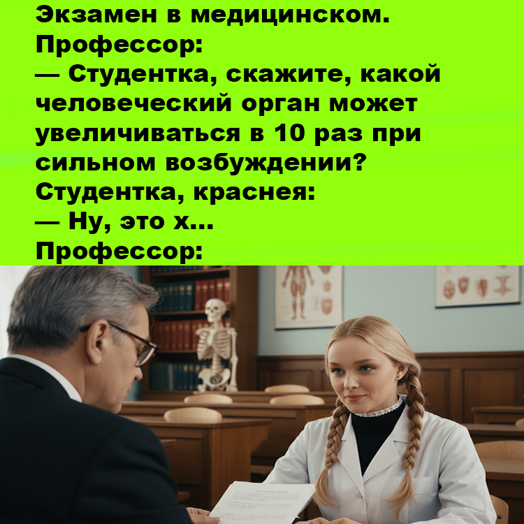 Экзамен в медицинском — это испытание не для слабонервных, особенно когда на кону знание сложнейших систем организма. В этом анекдоте блондинка-первокурсница демонстрирует профессору такой альтернативный взгляд на физиологию, что тот на мгновение забывает всё, чему его учили в академии.